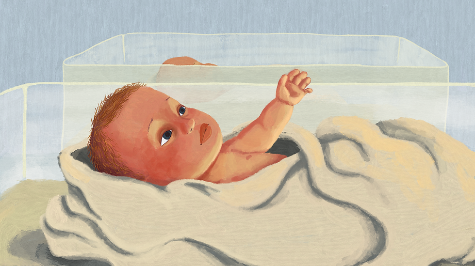 After designing the main baby of the story, I was also responsible for the previous scene, set in a maternity ward. The sequence begins by focusing on a white newborn before the camera pulls back to reveal the Black baby whose journey we follow throughout the film.